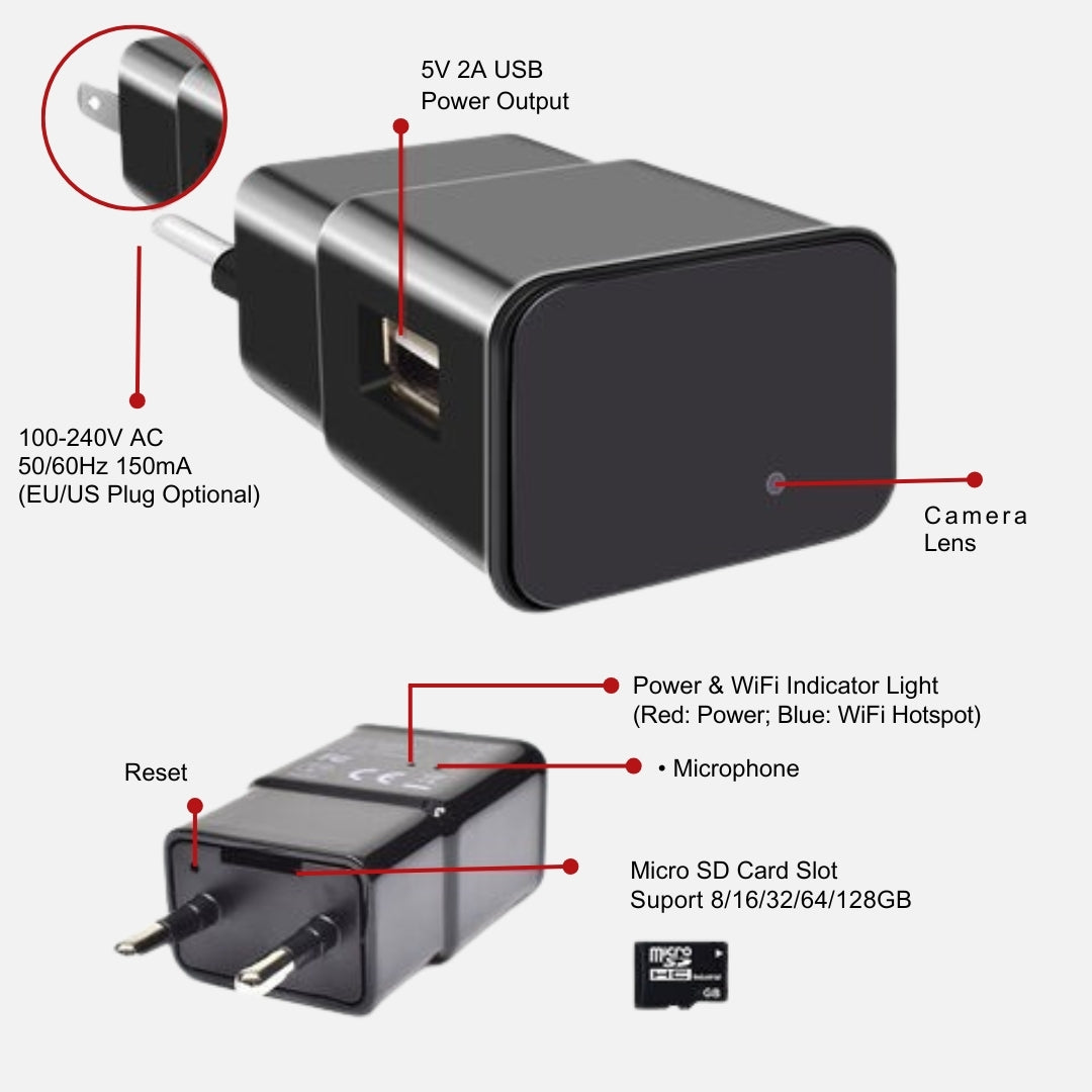 デバイスを充電しながら録画 - USBポートを使用して、カメラがバックグラウンドで録画している間に電話やタブレットを充電します。この追加機能により、充電器の本来の目的が完全に隠され、注意を引くことを避けます。