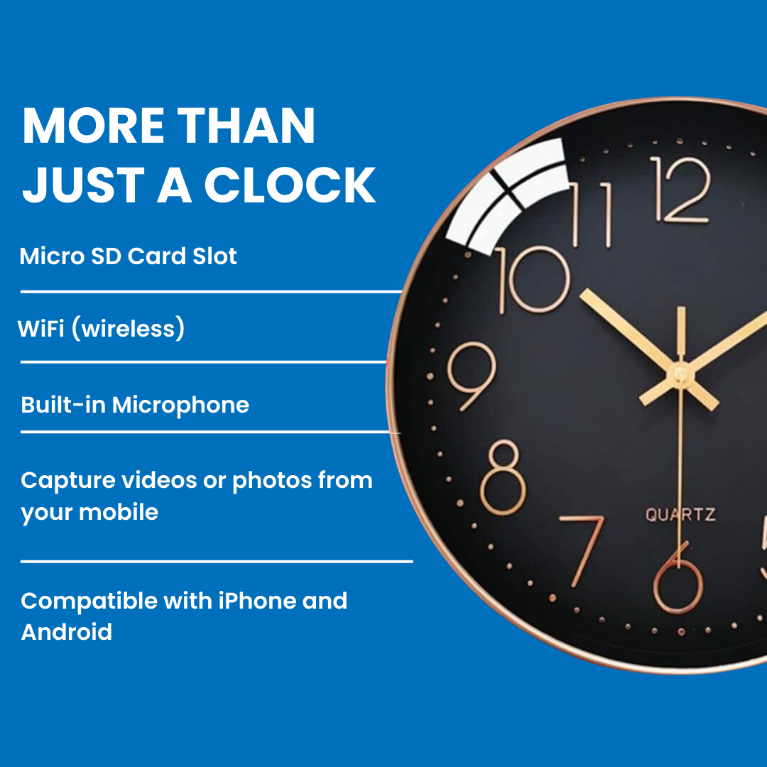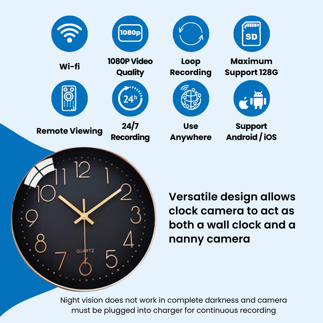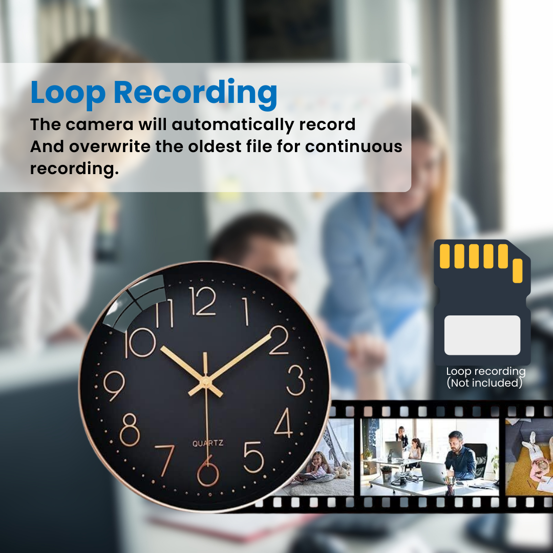 Automatic Loop Recording - Insert a micro SD card of up to 128GB (not included) and let the clock camera handle the recording automatically. Once the card is full, older recordings are replaced by new ones, so you never have to worry about missing important moments or constantly clearing storage.