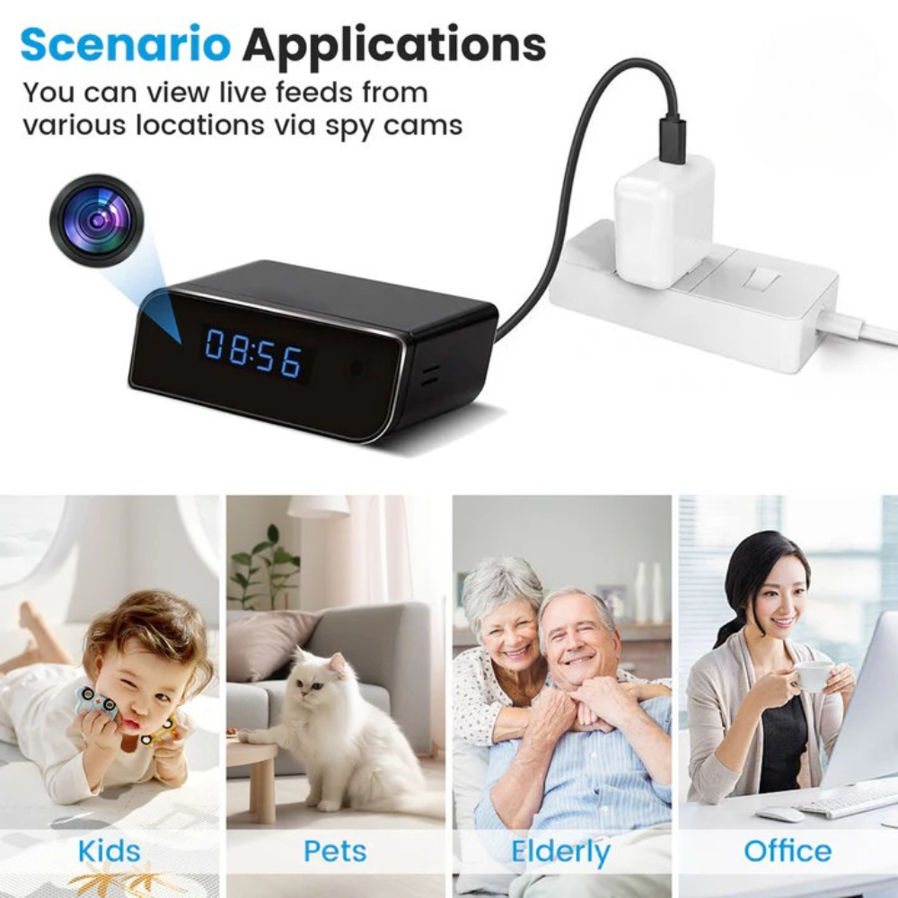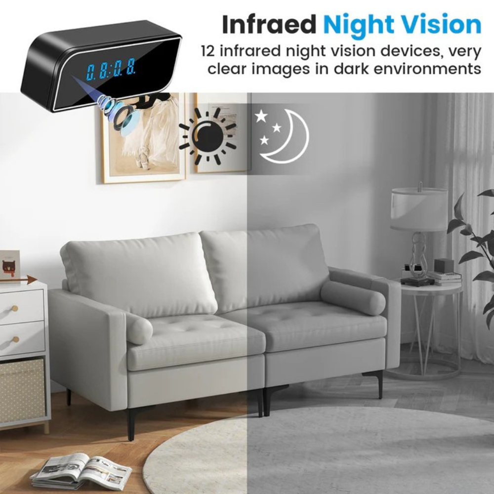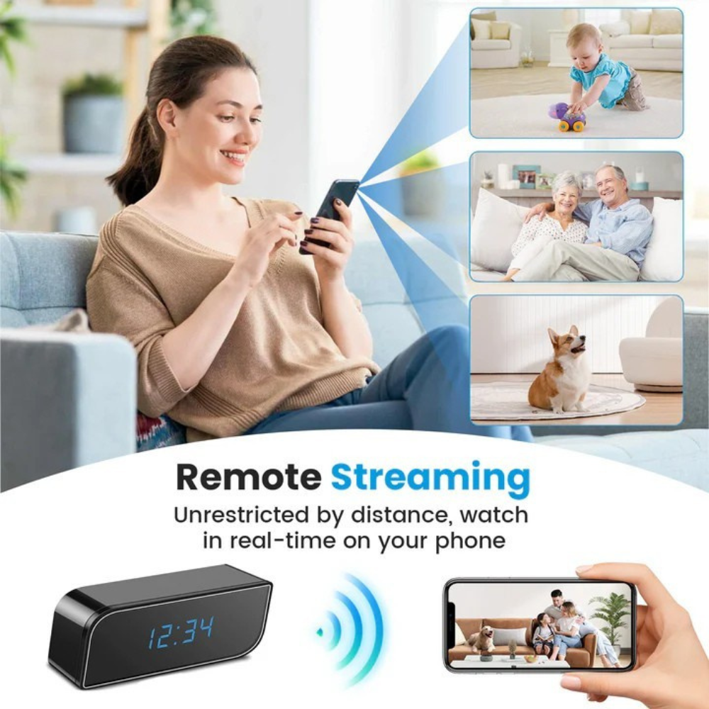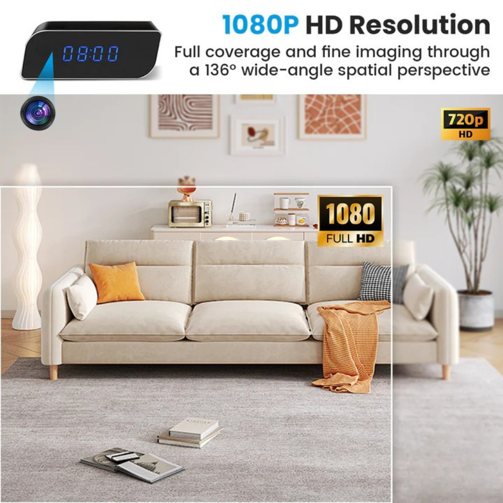 このスマートにデザインされた時計カメラで、最も重要なものを見守りましょう。家庭やオフィスに溶け込むように設計されています。フルHD録画、リモートビューイング、ナイトビジョン、ループストレージを備え、静かで信頼性の高い監視の完璧なソリューションです。普通の目覚まし時計のように見えますが、フル機能のセキュリティシステムのように機能します。